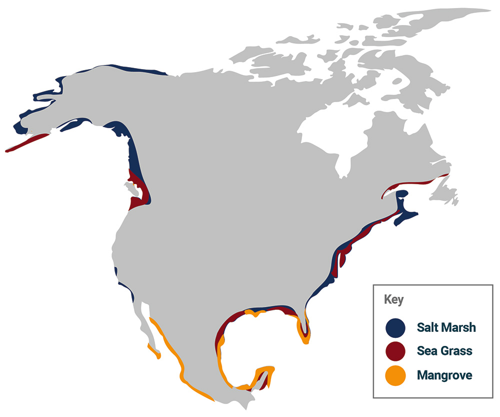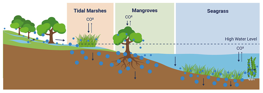 Blue carbon is the term used to describe the “watery” nature of carbon captured by the ocean and coastal ecosystems. Coastal blue carbon ecosystems refer to biomass-based coastal habitats, such as salt marshes, mangroves and seagrass meadows, that store carbon dioxide through photosynthesis. These ecosystems are a major carbon sink – storing about 50 percent of the Earth’s carbon, despite occupying less than 5 percent of global land area and less than 2 percent of the ocean. In addition to their carbon storage potential, these ecosystems create flood-resilient communities, provide economic benefits by supporting fisheries, enhance property values and improve nutrient cycling. However, the loss and degradation of coastal blue carbon ecosystems reduce future carbon sequestration potential and can emit carbon dioxide (CO2) back into the atmosphere. Therefore, the restoration, maintenance and conservation of these areas are essential to achieving global emissions reduction goals. Together, this makes coastal blue carbon ecosystems among the world’s greatest natural tools to address climate-related challenges today. In fact, the Intergovernmental Panel on Climate Change (IPCC) has recognized coastal blue carbon as a necessary pathway to harness the resiliency of nature and naturally remove excess carbon from the atmosphere.