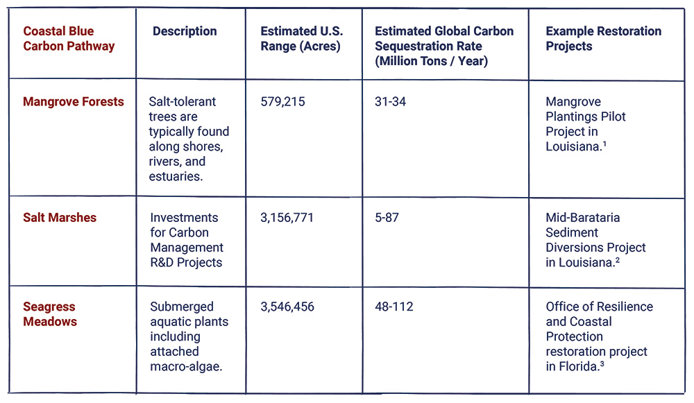 Estimated ranges of coastal blue carbon in the U.S. from the Commission for Environmental Cooperation. Estimated carbon sequestration rates of coastal blue carbon pathways from the National Academies of Sciences, Engineering, and Medicine.