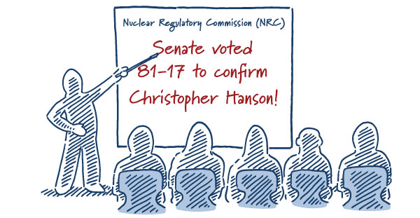 The Senate voted 81-17 to confirm Nuclear Regulatory Commission (NRC) Chair Christopher Hanson to another five-year term. Hanson received bipartisan support including Senate Environment and Public Works Ranking Member Capito (R-WV) and Energy and Natural Resources Ranking Member Barrasso (R-WY).